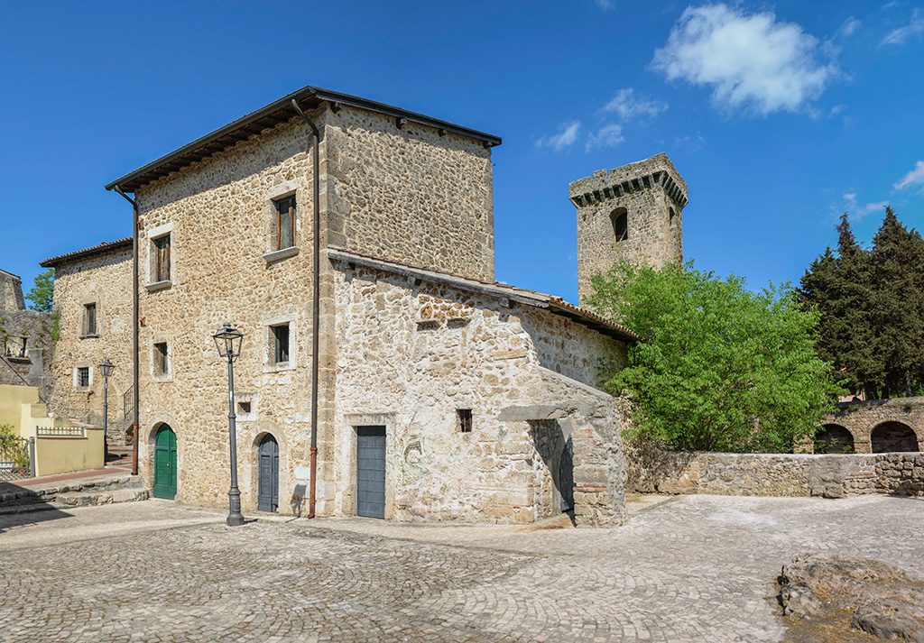 Fino al 1252, data della distruzione di Aquino operata da Corrado IV, l’abitato sviluppatosi sul pianoro, ad occidente dei tre grandi laghi, aveva continuato a coesistere con tale castello. Soltanto dalla fine del XIII secolo, attorno al Palazzo, inizia a svilupparsi un vero e proprio centro fortificato. La torre pseudo quadrata, ancora oggi visibile nella parte più alta del centro, fu realizzata a difesa del lato orientale privo di difese naturali. Nel XVIII secolo, con la costruzione della Cattedrale di San Costanzo Vescovo, distrutta durante l’ultimo conflitto bellico, la torre fu trasformata in campanile. Vicino alla torre è possibile ammirare i resti del vero e proprio Palazzo Comitale già conosciuto con il nome di Casa di San Tommaso d’Aquino. Sulla facciata campeggiano le due bifore, le finestre a doppia apertura, databili tra il XIV e il XV secolo. Dal palazzo si sviluppa il sistema difensivo costituito da due cinte concentriche, di cui quella più esterna mostra una serie di torrioni a pianta quadrata e circolare realizzati forse nel XIII secolo. Nella parte più bassa dell’abitato si possono osservare i resti della grande torre cilindrica realizzata a difesa del ponte che, sfruttando una strozzatura naturale degli argini, permetteva l’attraversamento dei laghi. Poco prima della torre, attraverso un passaggio voltato, si accede al Parco del Vallone. Visitabile su richiesta.